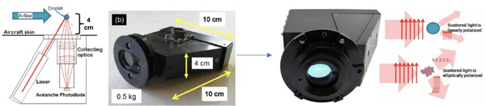Схема автофлуоресцентного нефелометра. Ультрафиолетовый лазер светит сквозь окошко в корпусе (aircraft skin) атмосферного зонда. Пролетающие мимо частицы аэрозоля рассеивают лазерный свет, придают ему поляризацию (линейную в случае круглых частиц и эллиптическую в случае неправильной формы) и вызывают их флуоресценцию. Второе окошко и собирающие линзы направляют все это излучение на регистрирующие приборы (показан лавинный фотодиод) / © https://venuscloudlife.com/wp-content/uploads/2021/12/VLFRep...