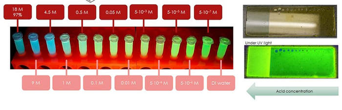 Флуоресценция растворов флуоресцеина в растворах серной кислоты. Концентрация указана в молях на литр; 0,1 М соответствует концентрации 0,98%, при более высоких концентрациях зависимость массовой доли от молярности начинает отклоняться от линейной из-за возрастания плотности раствора. Поскольку длины волн флуоресценции биомолекул тоже зависят от кислотности, ученым нужно знать истинную степень кислотности частичек облаков (которая зависит не только от концентрации кислоты, но и от примесей других соединений). Для этого в одном из последующих атмосферных зондов будут установлены пластинки, покрытые тонким слоем флуоресцеина и перехватывающие капли аэрозоля, как на фотографии справа. По цвету флуоресценции возникающих пятен будет определено, какую кислотность имеют капли и каково ее распределение / © https://venuscloudlife.com/wp-content/uploads/2021/12/VLFRep...