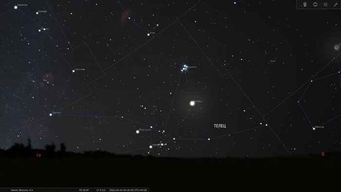Меркурий движется по созвездию Тельца (6 июля планета перейдет в созвездие Близнецов, и её видимость гарантированно завершится). С 21 по 24 июня Меркурий будет проходить мимо звезды Альдебаран (альфа Тельца) и рассеянного звездного скопления Гиады.