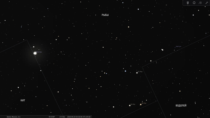 Нептун все лето проведет на границе созвездий Рыб и Водолея. Его видимое положение среди звезд за эти месяцы практически не изменится — далекие планеты перемещаются вдоль эклиптики крайне медленно.