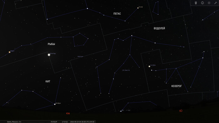 В конце июня в созвездии Водолея в бинокль или подзорную трубу можно найти астероид Весту. Но и она вскоре в попятном движении догонит Сатурн в созвездии Козерога. А поздней осенью вернется в Водолей.