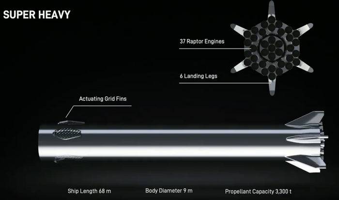 Количество двигателей на бустере Super Heavy будет либо 37 (вариант ниже), либо 43, из которых внутренние 6 будут способны работать под углом (gimbal) для изменения траектории ракеты. Бустер высотой в 68 метров будет вмещать 3300 тонн топлива.