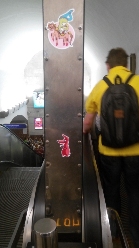 Недавно на переходе Маяковская - Площадь Восстания, заметил эти наклейки. Но это уже новые, раньше были другие. И стала понятна схема, большой поток людей, центр. Приклеиваешь каждый раз две наклейки, кто-то заинтересуется и посмотрит копирайты. Хотя возможно сам создатель тут и не причём, наклейки всегда разные.