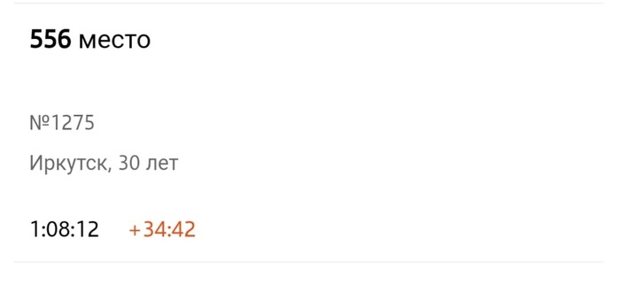 Результаты, конечно, не астрономические, но цель была просто выжить и пересечь финишную черту. Напомню: прошел дистанцию в 10км. За все время дыхание не подвело, печень не вышла из чатика, вкуса железа во рту небыло. Исключительно проблема в нижней части ног.