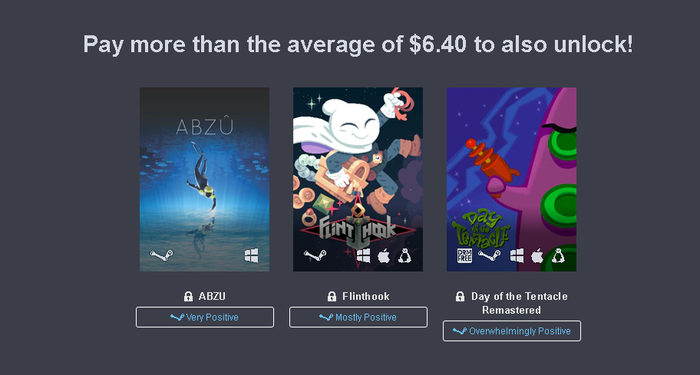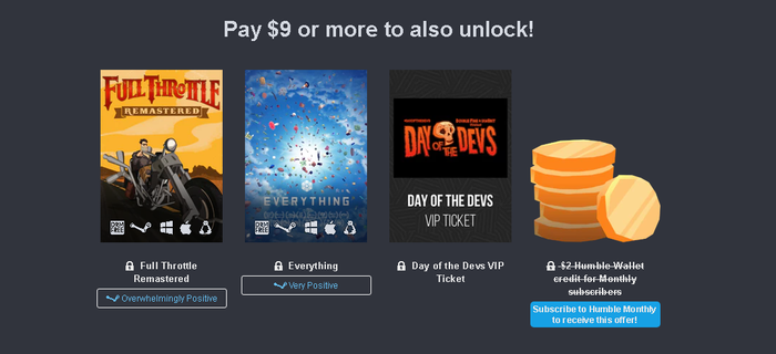 ну и тем кто купит бандл за 9 $ Достанется очень крутой олдскульный квест Full Throttle, игра everything с очень положительными отзывами, а также 2 $ на месячную подписку HB и вип-билет на выставку, на которую из нас все равно никто не пойдет.
