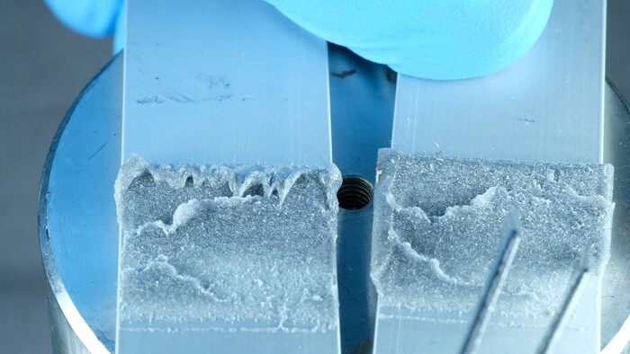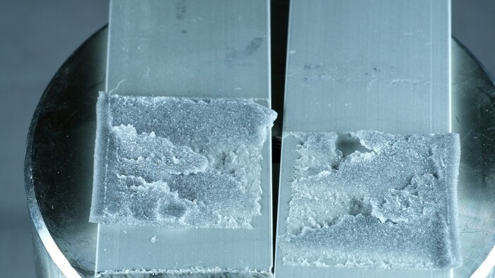 А вот тут смотрите как интересно. Видите как произошел разрыв? По бокам получился адгезионный разрыв. Причем четко видна граница, где скотч соединяется с материалом, а где болтается свободно. Такое поведение ленты можно было бы списать на мою криворукость при разрыве склейки в ручную, но обратите внимание, что именно эти участки вздулись от воздействия сольвента.