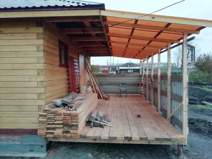 За отделкой бани прошел весь летний год и его не хватило. Работал по вечерам и выходным. Плюс отпуск ездили попутешествовать на Алтай. Понял, что не хватает сухого места для строгания, пиления, шлифования. Решено было сделать крытую веранду. Купил лопасти для винтовых свай и с б/у труб сделал 4 сваи. Обвязал уголком на которые стала опираться веранда. Крышу веранды закрыл профлистом из цветного поликарбоната. Бока временно зашил обрезками профлиста и старым баннером. Фото с баннером нет. Но в октябре я провел воду на участок и завел ее в баню. В ноябре 2021 была первая помывка. И даже встречали с друзьями в еще не до конца доделанной бане Новый 2022 год!!!