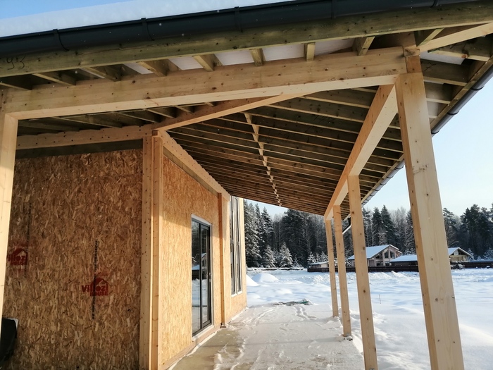 Как потеплело, приехал, загерметил швы, так же за то время пока нас не было, остеклили веранду и мы смогли наконец то отделать столбы. И собственно вот уже финишный вид.