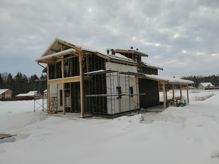 Выставили обрешетку, выровняли свесы, потолки, и начали зашивать панелями. Смонтировали водосточку.