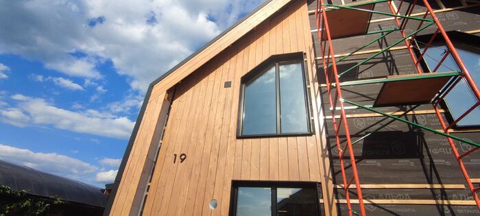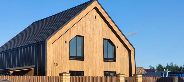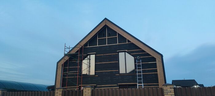 Вот такой конечный вид дома. В живую смотрится очень стильно, современно, но главное для меня очень дешево по деньгам. Деревянная часть фасада обошлась примерно в 50к одна сторона (планкен елка АВ + 1 слой праймер + 2 слоя пропитка финская)