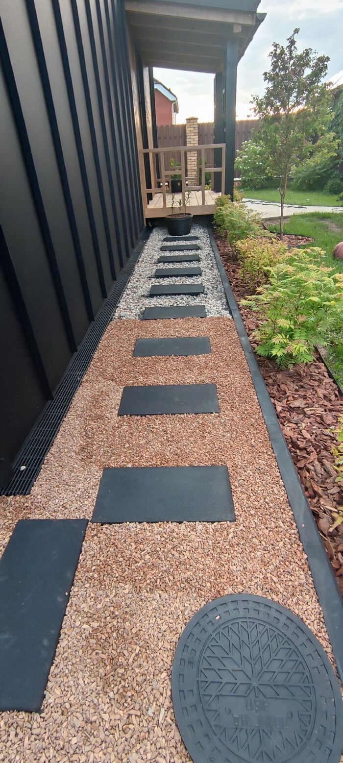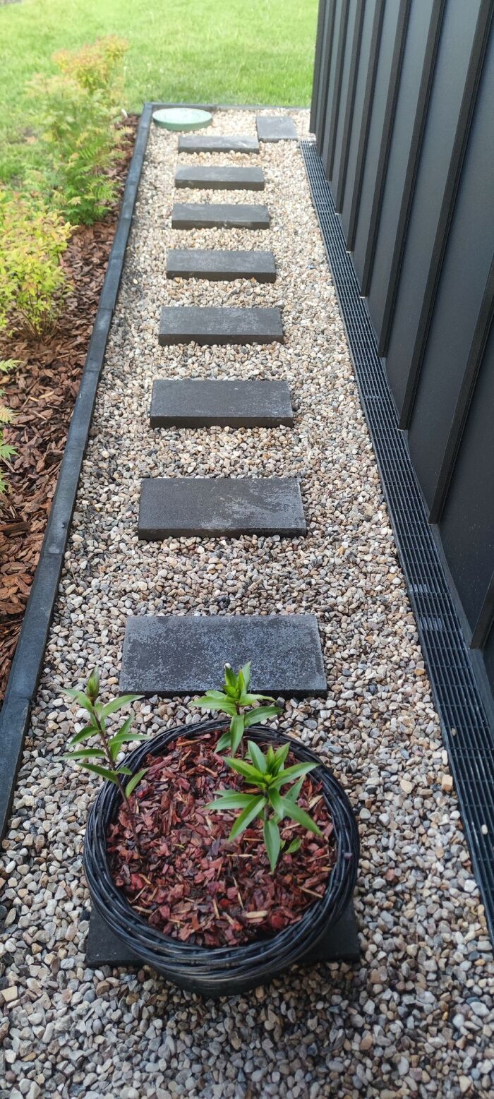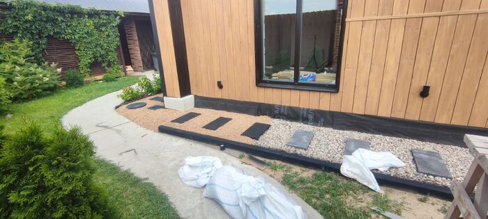 Для формирования окончательного вида отмостки купил плитки бетонные типо черного цвета, но так как они по факту серые, то покрасил из баллончика черной матовой краской.