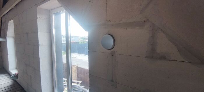 Вот так это выглядит изнутри. Далее труба утепляется и после чистовой отделки установится система притока.