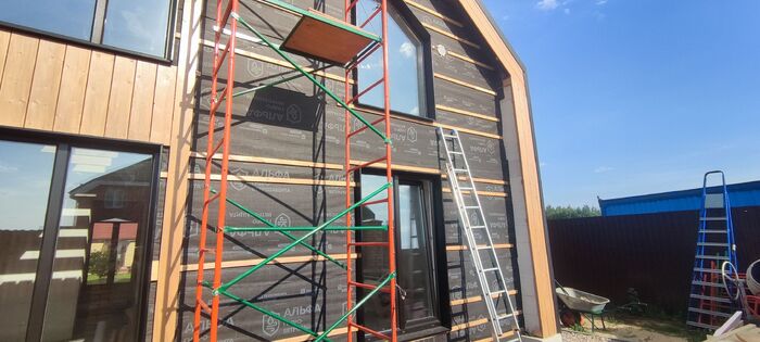Так как для обшивки буду применять планкен прямой, то будут щели. Поэтому монтирую гидро-ветрозащитную мембрану (обязательно диффузионную).