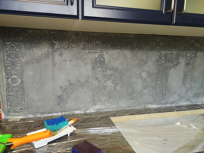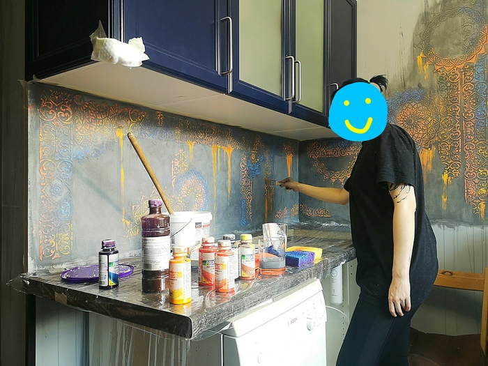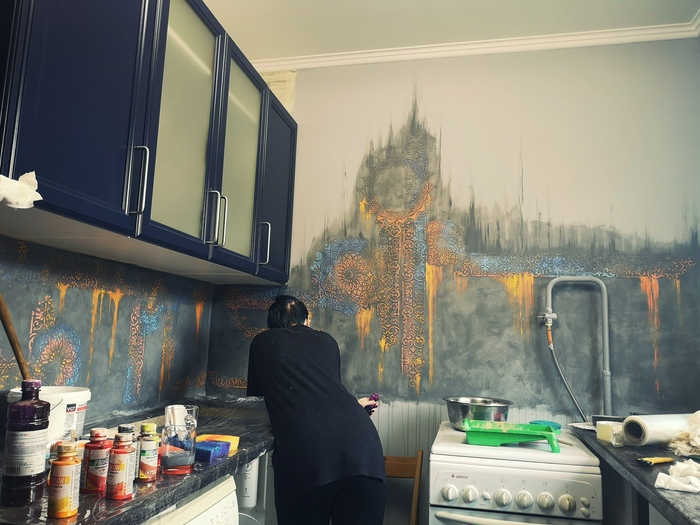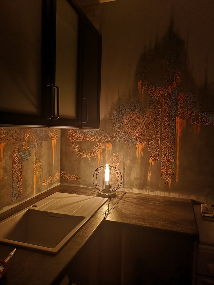 В моей крошечной 6ти метровой кухне хотелось сделать что то такое, что сделает её супер уютной. Давно ходила вокруг трафаретов, пересмотрела кучу видео и в каждом удивляла простота. Итого: остатки штукатурки со старого ремонта, 2 трафарета с маркетплейса по 300 р., остатки краски со стен, банка белой краски, пара банок колера.