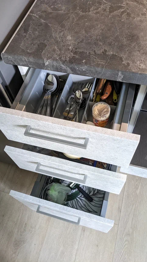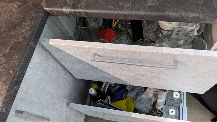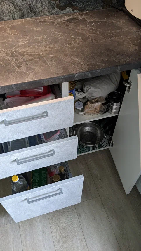 Под раковиной - фильтр (осмос - альтернатив все ровно нет) , измельчитель отходов и расходники для пмм (соль, порошок, ополаскиватель)
