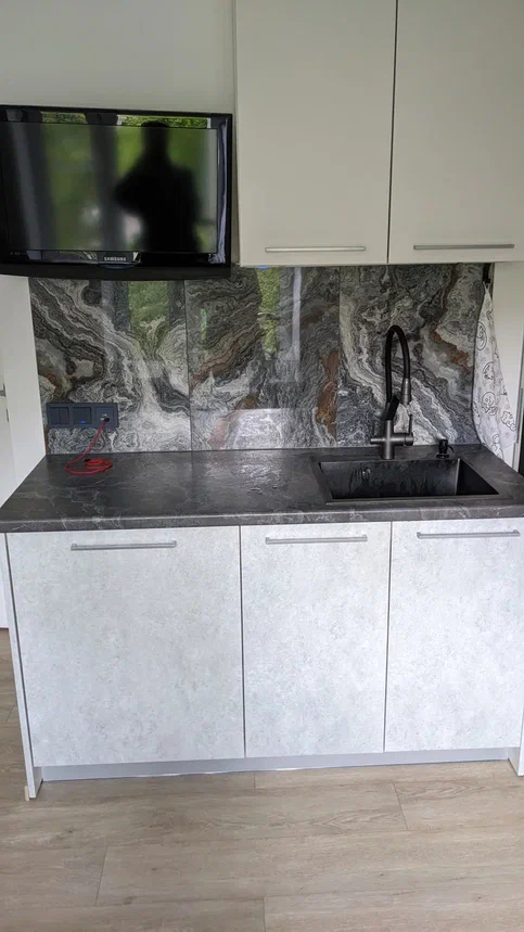 Фартук - керамогранит. Ибо красиво + он нависает над столешкой и закрывает ее край без всякого страшного уголка (а они все страшные).