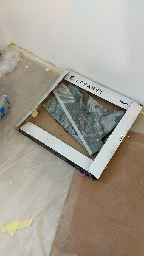 Далее после нижнего яруса кухни - был монтаж керамогранита 60 на 60см. 1 кусок был треснут - и заметил я уже приклеив его. Пришлось снимать.