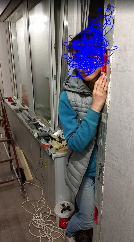 На фото жена устало придерживает откос - чтоб приклеился