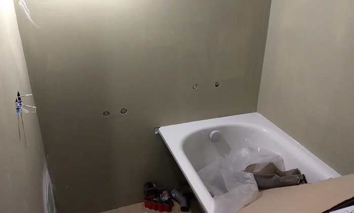Далее ставим ванну -она слегка врезана в стены - это позволит плитке 'наползти' на нее и избежать необходимости страшных силиконовых швов ( как их не делай - все ровно выйдет херня)