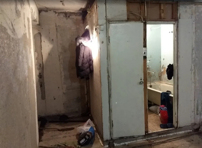 На фото ванная комната. Слева туалет.Спереди кладовка. Справа трубы идут на кухню