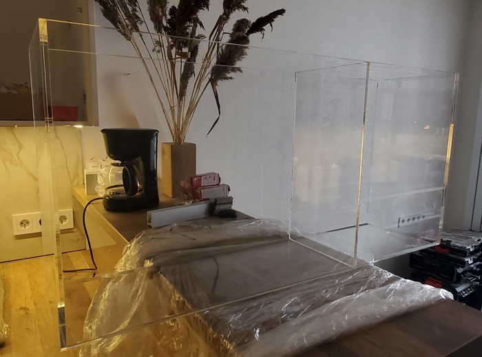 Заказал бокс в снятый размер с разделением из 10мм оргстекла (дерево и керамогранит отверг из-за веса и толщины), объем получился почти 70л.