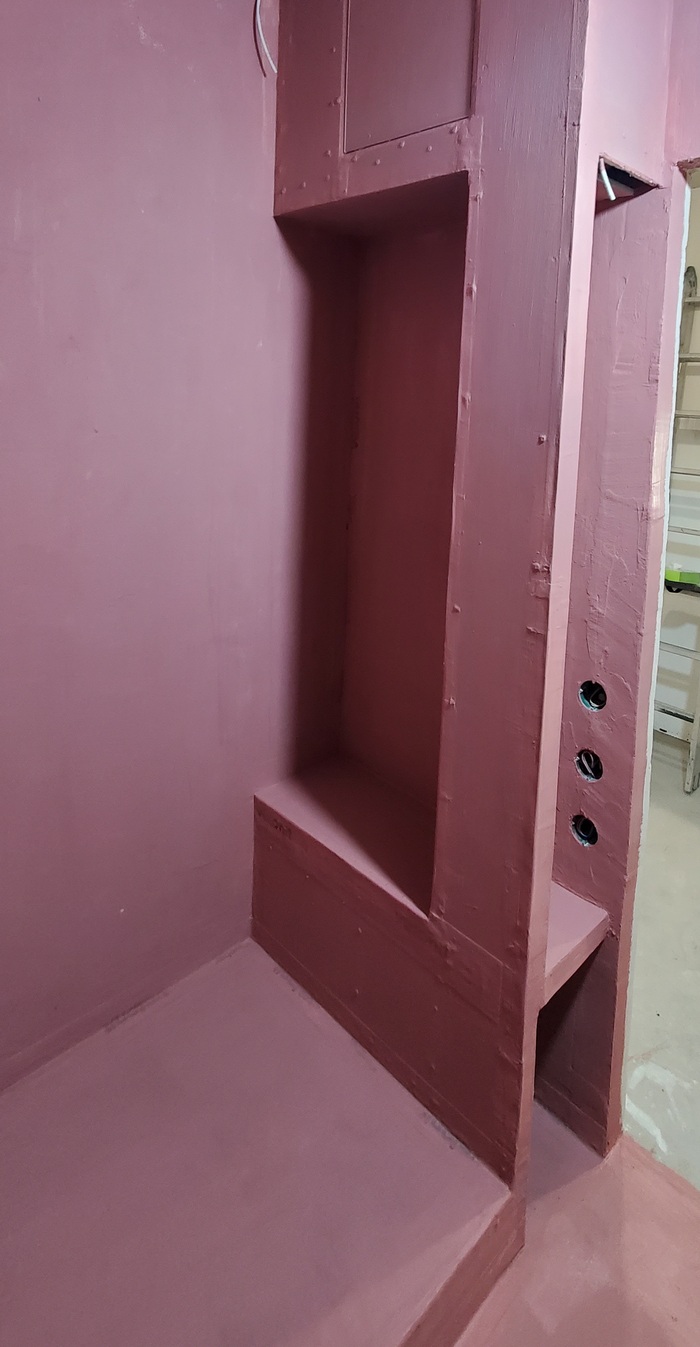 При проектировании душевой размером чуть более 4м^2 нужно было предусмотреть практически все. Ящик прекрасно подходил для не используемого пространства под скамейкой.