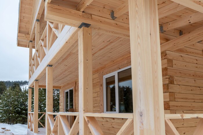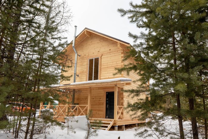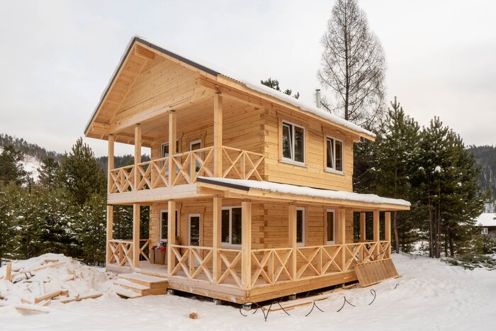 Дом построен из бруса естественной влажности, 180 на 180 мм. Это основной деловой лес в Иркутске и из него строится 90% деревянных домов. Здесь использовался зимний лес