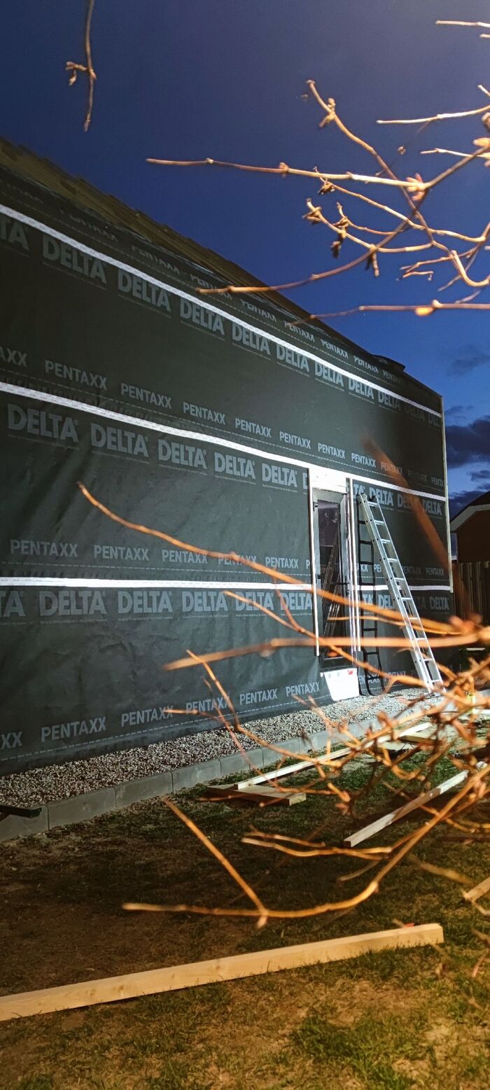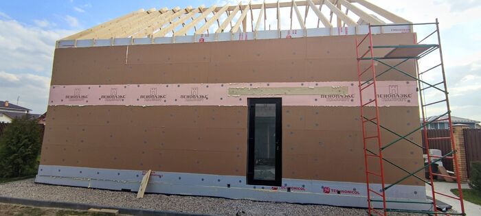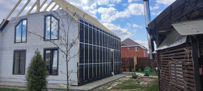 После стропил сразу начали утеплять стены. Снизу пенополистирол и в зоне армопояса, в остальном случае панели белтермо.