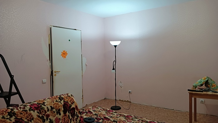 Начало ремонта не публиковала. В принципе ничего интересного: демонтаж обоев, расшивка/ заделка швов по стенам и потолку. Ничего нового, кроме спорного момента заливки полов