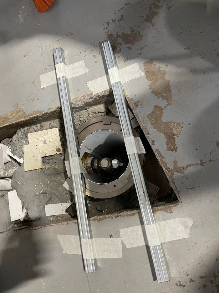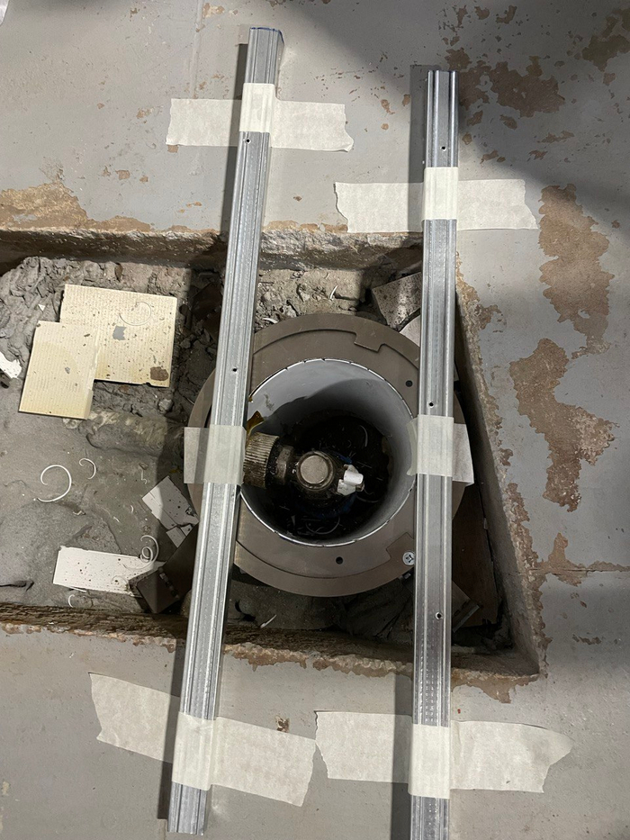 В понедельник новой недели мы получили наш сложнейший механизм закрытия ниши. И вновь мы отвлеклись на столь увлекательное занятие как борьба с ямой. Недолго думая я решил "выставить" получившуюся заготовку. Точно по уровню пола чтоб ничего не выпирало и не проваливалось. В ход пошли профиля для гипсокартона которые я нашел в каком-то углу офиса и приватизировал их (для дела же!).
