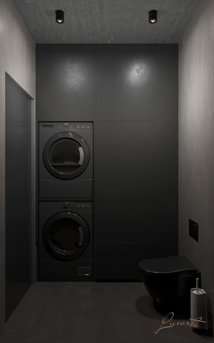 Здесь можно поставить стиральную машину, сушильную машину. Это очень удобно, потому что основную часть времени мы проводим в зоне кухни-гостиной.Вы заходите сразу в туалет, чтобы не бегать по квартире. А еще это решение удобно для гостей, а не в ваш личный санузел с интимными вещами.