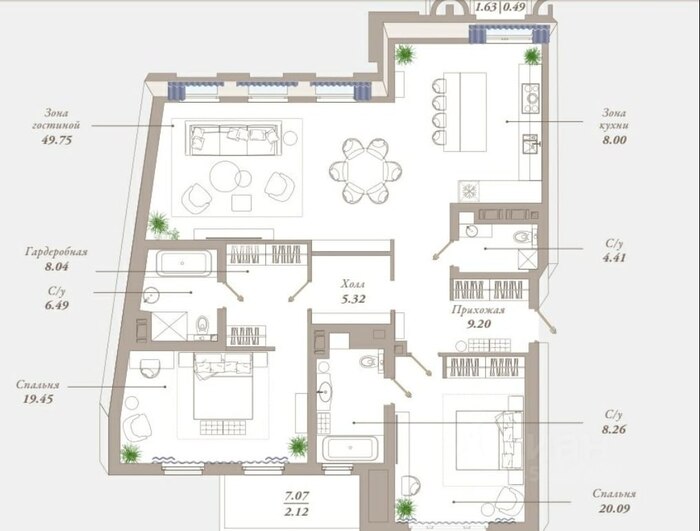 Санузлы практически в центре квартиры и в них удобно разместить потолочные пространства, вент установки, канальные кондиционеры, чтобы не было внутренних и висящих наружных блоков.