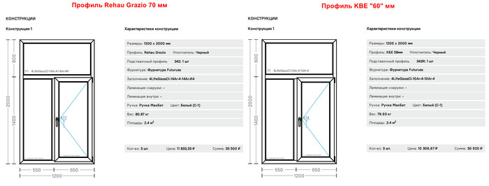 Профили стандартно бывают 3 типоразмеров толщины 60-70-80 и чем толще профиль, тем он теплее, тише, жёстче, ну и само собой дороже. Разница около 25% между соседними толщинами.