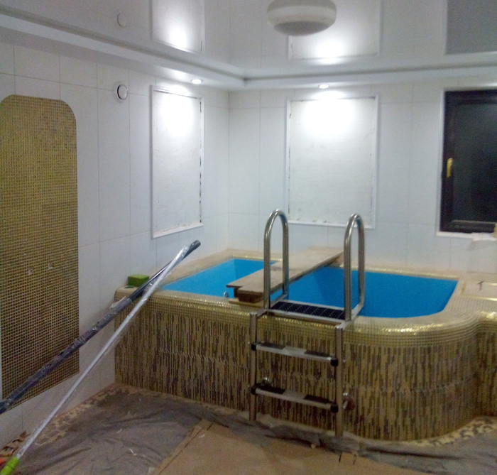 Напоследок, хочу рассказать немного про интерьер - пластиковую купель делали не мы, она была на объекте еще когда мы начинали. Прочую отделку, включая мозаику и плитку делали мы, по нашему же проекту. Удобно когда одна организация делает все под ключ: не на кого свалить косяки одни руки - одна ответственность. Мозаику пола, к сожалению, не получилось сделать из темных камешков - были какие-то проблемы с ее заказом, а мы очень спешили. Стыковать стеклянную мозаику, подрезать ее в местах закругления мой замечательный плиточник и друг сильно заколебался (он говорил другие выражения, видимо от стресса я позабыла какие Х))