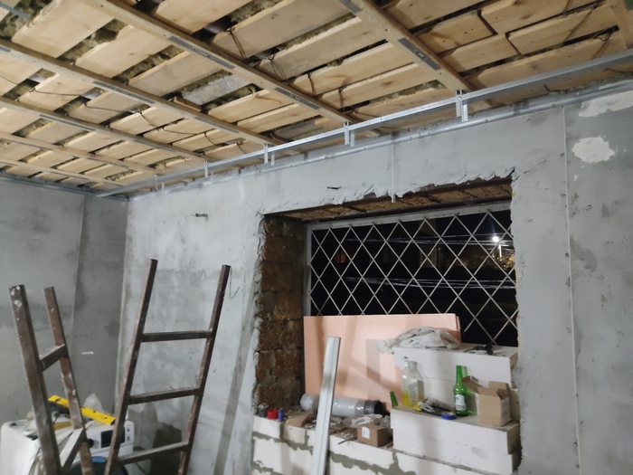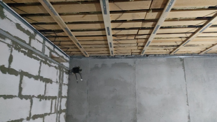 Всем привет, уважаемые господа. Хочу поделиться слайдом фото, как мы делали себе потолок первого этажа в кухне с нуля и до финала. У нас на армопоясе лежат не деревянные, а металлические балки. Сверху на втором этаже будет деревянный пол, об этом в следующих постах.