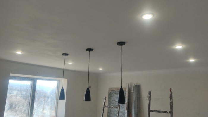 10. Красили в 3 слоя. Сначала пробовали валиком, эффект мучительный) потом делали пульверизатором, ещё 2 слоя. В итоге получился идеально белый потолок. Вырезали отверстия под светильники, которые заранее отметили привязали на бумажке.