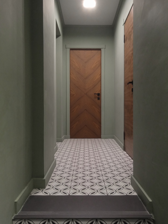 О, ещё есть ничем не примечательная прихожая и верхний коридор. Там моя ещё одна гордость - самолично установленные 5 межкомнатных дверей! А рисунок их! Это же охххх! Ну точнее это шпон американского ореха с крутым диагональным рисунком. Которые я купила новыми на фиг знает каком складе за тысячу каждую. Теперь понимаете, что показать эти фото и повздыхать Я обязана?😁