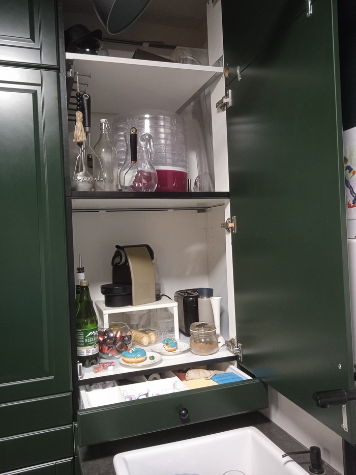 Но там действительно был продуман каждый шкаф, уголок и стыки всего и со всем. Брала икею и мастерила угловые шкафы сама, так как, конечно, размеры не подходили по ширине. Внутрь нижних углов были запихнуты системы полок от сетчатых внутренностей гардеробных Икеа (спасибо за лайфхак любимой Ксении из просто ремонта). А верхний уголовой шкаф подпилен до нужных размеров и ящик открывается прямо над мойкой, ничего не задевая. Там, в углу, живет всякая нужная хрень (например, прячутся огрызки пончиков от собаки) и кофемашина)