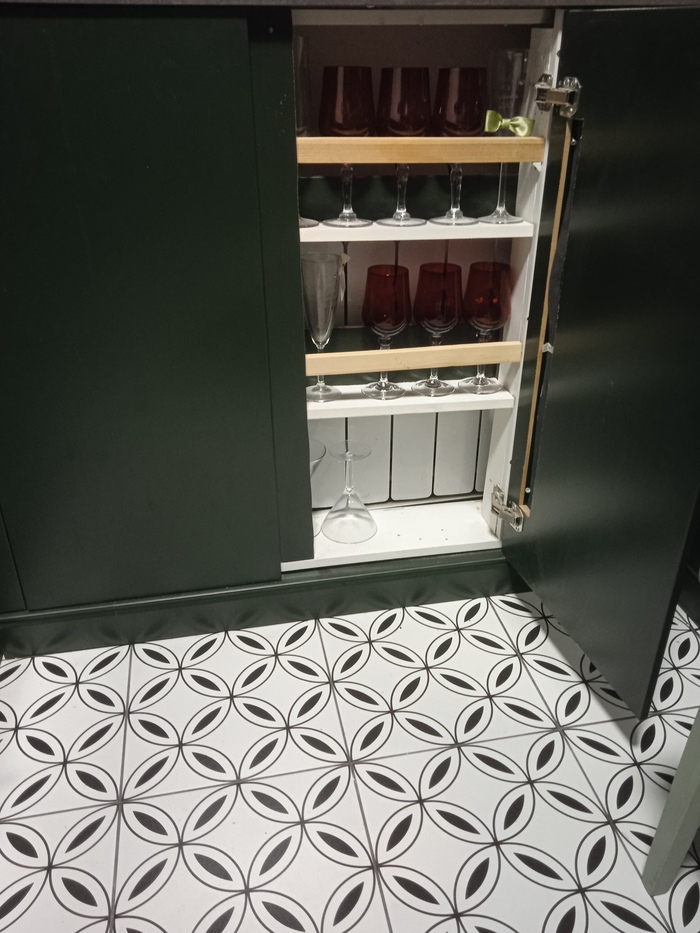 Под окошком живёт батарея, для которой сделана вентиляция в фасадах, в небольшое пространство около нее впихнулись полки для высоких бокалов. Конечно, их я ещё тоже не доделала: надо покрасить и все такое. Но за закрытой дверкой не видно и совесть спит.