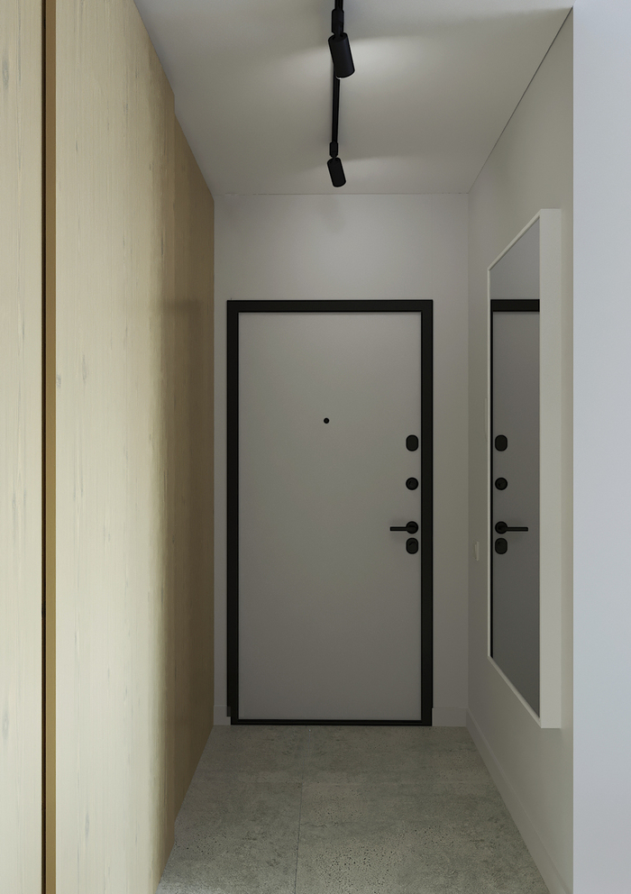 Открытых вешалок и обувниц, как вы видите, нет - по задумке все это прячется в огромный шкаф-купе, тем самым избавляемся от кучи визуального мусора.