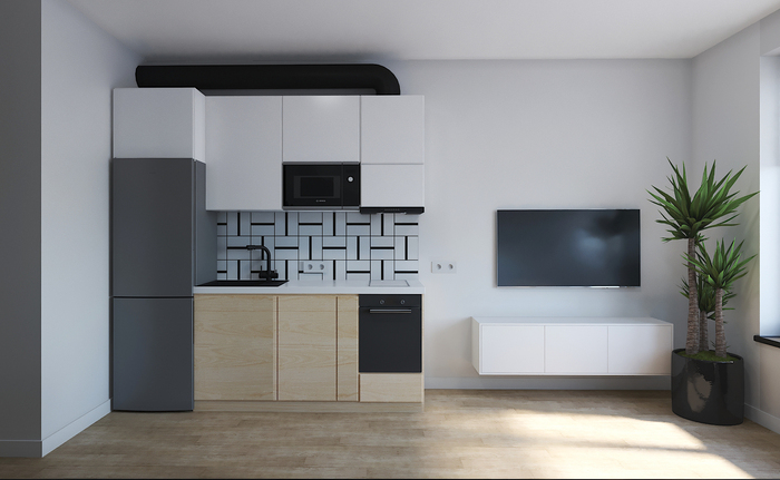 Но по факту во время обмера оказалось, что выводы под унитаз и выводы под раковину как-то поменялись местами, и розетки под ТВ на кухне-гостиной переехали на другую стену. Поэтому расстановку мебели мы немножко скорректировали под предложенные условия: