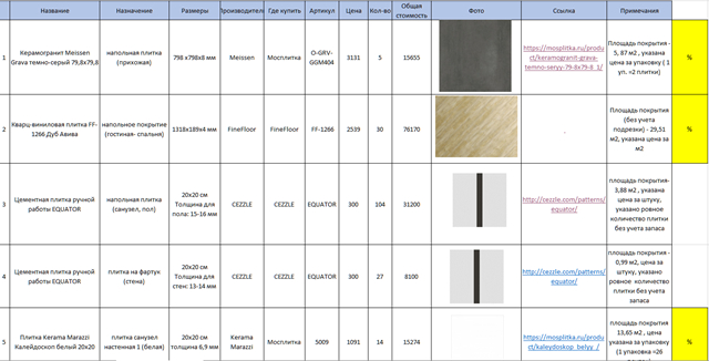 После, я собираю табличку в Exel со всеми выбранными и утвержденными чистовыми материалами, освещением, мебелью. Там указана стоимость, размеры, а также есть ссылки на магазины, где это можно купить.