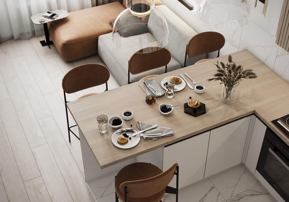 С первого взгляда, может показаться, что все очень просто, а где тут ваш знаменитый «дизайн». Но в данном случае дизайн – это не подушки в цветочек и ламбрекены, а геометрия и пропорции материалов: сколько должно быть белого, зеленого и дерева, чтобы почувствовать гармонию.