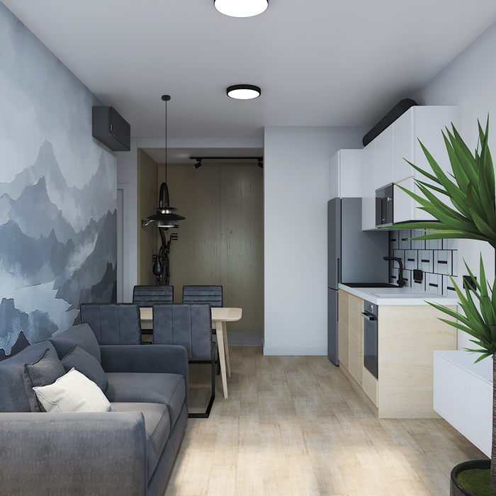 От коллажей на этом проекте я решила отказаться, потому что интерьер задумывался достаточно минималистичный, и было проще сразу работать в 3d и уже там утверждать всю стилистику.