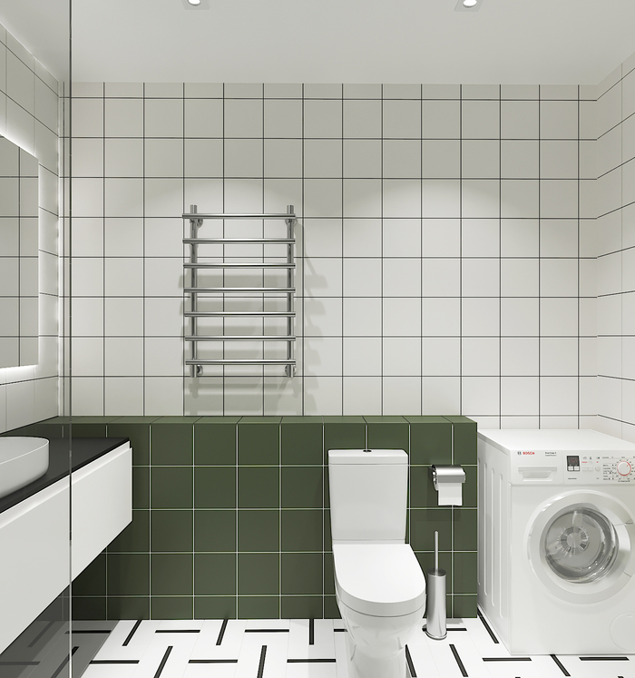 Для санузла использовали самую простую квадратную плитку от Kerama Marazzi Калейдоскоп белый 20х20 см и Калейдоскоп зеленый темный 20х20 см с контрастной затиркой.