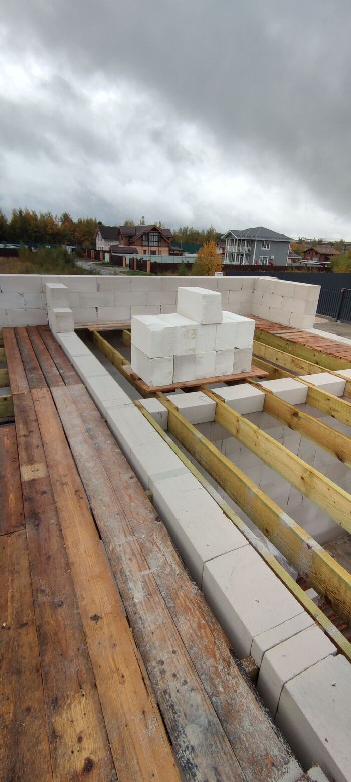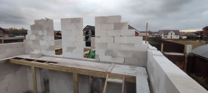 Сформировал подпорки окон, установил доску с меткой по высоте конька и натянул нитку для понимание уклонов фронтона. Далее по старой схеме, сформировал из 50мм блока опалубку для армопояса, но внутри пока не делал, для удобства установки армопояса. После установки его я доложу блок 50мм уже с внутренней стороны. Окна радуют, а еще радует что они одинаковые))).
