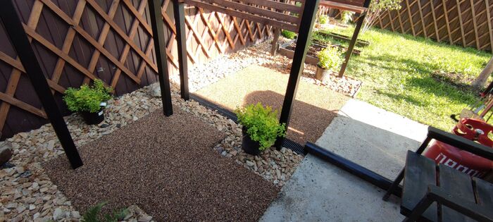 Бетон обработал полиуретановой грунтовкой и нанес камешковый ковер.