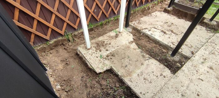 Вокруг убрал землю, засыпал песком и застелил геотекстиль. Сверху щебень желтого цвета.
