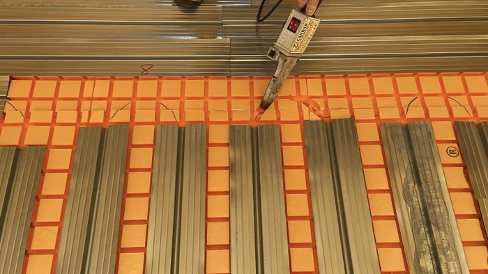 При необходимости маты легко подрезаются ножом (входит в комплект). Укладка происходит "в замок" с совмещением пазов под будущие теплораспределительные пластины.
