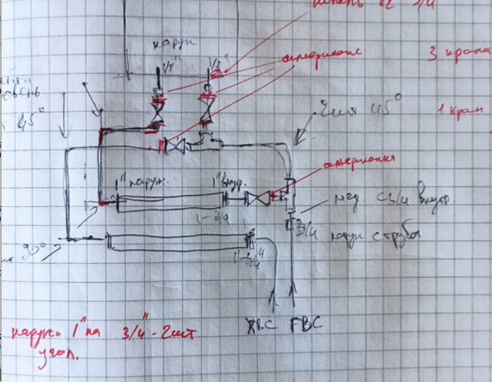 Так как у меня квартира с индивидуальным отоплением, а это значит что горячую воду у меня готовит газовый котел. Я знал, что путь горячей воды от котла до ванный большой и займет 30-40 секунд. Решил ставить дополнительно бойлер. Он играет роль термоса. Теперь горячая вода польется через 5 секунд. А эту схему я рисовал, чтобы понять как все сделать так, чтобы я мог пользоваться либо только бойлером, либо только газовым котлом, либо и газовым котлом и бойлером, соединенными последовательно. Если городить уж такую схему, надо делать ее ремонтно-пригодной решил я.